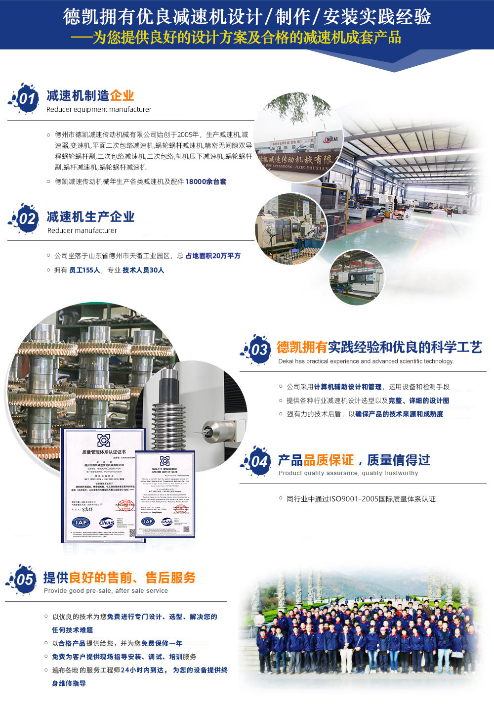 德州市德凱減速傳動(dòng)機(jī)械有限公司,生產(chǎn)減速機(jī),減速器,變速機(jī),平面二次包絡(luò)減速機(jī),蝸輪蝸桿減速機(jī),精密無(wú)間隙雙導(dǎo)程蝸輪蝸桿副,二次包絡(luò)減速機(jī),蝸輪蝸桿,軋機(jī)壓下減速機(jī),蝸輪蝸桿副,蝸桿減速機(jī),蝸輪蝸桿減速機(jī),公司占地面積20萬(wàn)平方,員工155人,技術(shù)人員30人,年生產(chǎn)各類減速機(jī)及配件18000余臺(tái)套。在同行業(yè)中通過(guò)了ISO9001質(zhì)量管理體系認(rèn)證。公司設(shè)備齊全、技術(shù)力量強(qiáng)大、檢測(cè)手段完善,引進(jìn)國(guó)外大型數(shù)控二次包絡(luò)機(jī)床GJK75加工數(shù)控4臺(tái),可加工到800二次包絡(luò)蝸輪蝸桿。引進(jìn)漢江S7732蝸桿磨床3臺(tái),精度可達(dá)5級(jí)。公司擁有輝光離子氮化爐4臺(tái),經(jīng)該設(shè)備氮化后可提高蝸桿表面硬度、耐磨性高、提高疲勞強(qiáng)度、變形量小、耐蝕性、...